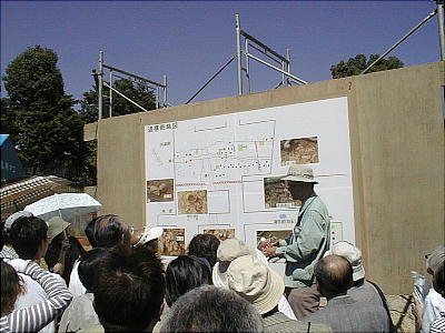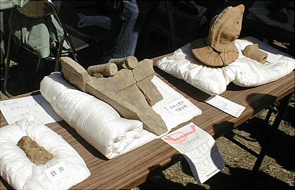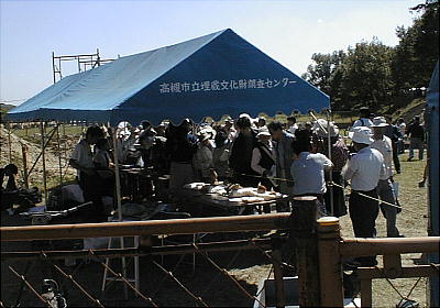 説明パネル横の青いテントの中には、地中から取り出した埴輪の断片が置かれていた。一段落したら高槻市役所の