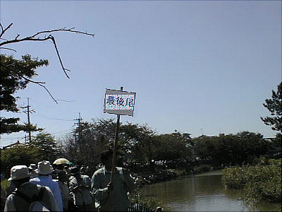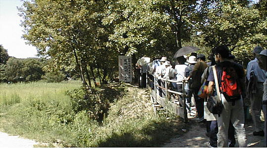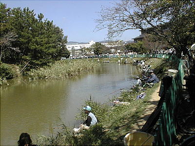 上左の奥が行列の最後尾。壕を渡って堤の上をまたあのあたりまで戻るのだ。太公望達もみんなに釣果を聞かれて
