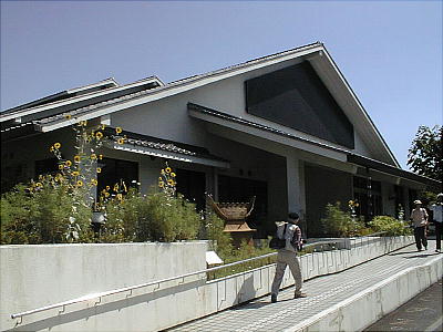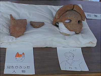 臨時バス停となっていたコミュニティー・センター前の植え込みには、以前の調査で発掘された埴輪のレプリカが