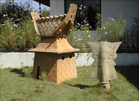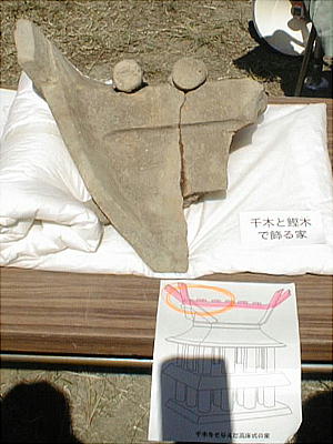 家形埴輪は、土台には直径約13センチの円筒の柱が残り、神社建築の屋根に特徴的な千木(ちぎ)や堅魚木(か