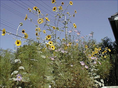 咲き遅れのヒマワリと、今が旬のコスモスが並んで咲いている。まさに秋の空である。