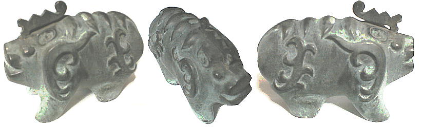 くぼんだ穴に差し込まれている。胴体の左右には、前後に羽根上のたてがみが上図のように浮彫されていた。4本の足は短く