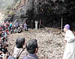 海食洞「オビヤの浦」で参加者に生誕地伝説を説明する文教授(右)=14日、佐賀県鎮西町の離島・加唐島(田中操写す)