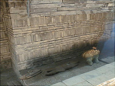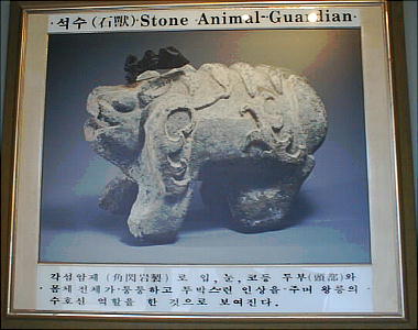 墓の入り口には獣の石像が置いてあった(上右)。説明では「石獣」とあるが、ガイドブックには「石熊」と書いてあるもの