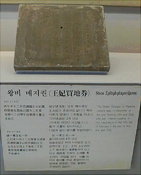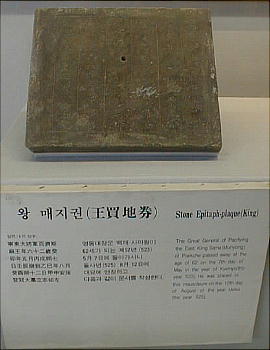 遺物の中で最も注目を集めたのは、この王陵が百済第25代武寧王(462〜523)と王妃の合葬陵である事を明らかにした誌石と、