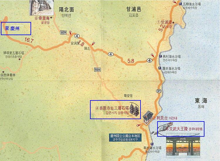 ている。文武大王は、「死して龍神となりて故国を守らん」と欲し、東海中から海岸を通って新羅の都「慶州」まで「龍の