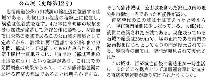 ルの南方150Kmに位置する公州(コンジュ)市「熊津城」へ移した。中心都城であった公山城は錦江(クムガン:白馬江)の南岸
