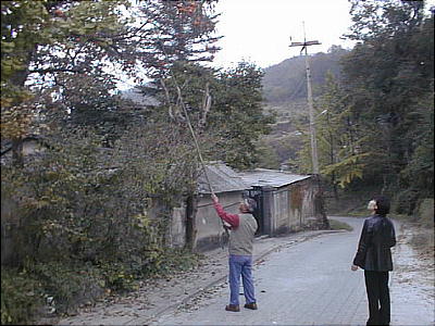 見学を終えて坂を下っているとき、柿をもいでいる人にであった。私などは子供の頃よくやった、長い竹竿の先を割ってそこに柿の