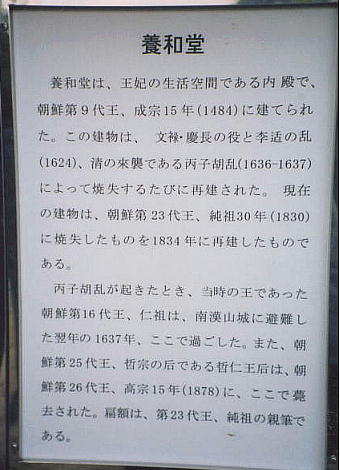 (1624年)の時に再び焼失してしまったが、その後、第9代王の1483(成宗14年)に、三人の大妃(元王の妃)のために再建して、