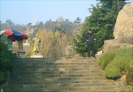 韓国の観光客がやっていた撮影スタイルを真似て我々も同じように写して貰った(上左)。上右奥の石像は、秀吉軍を