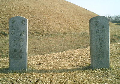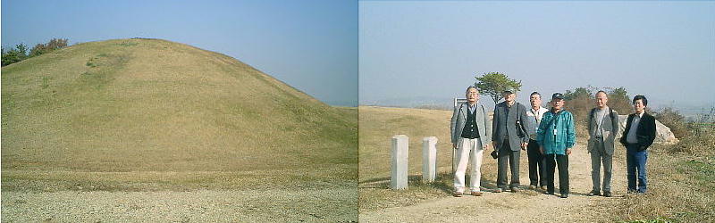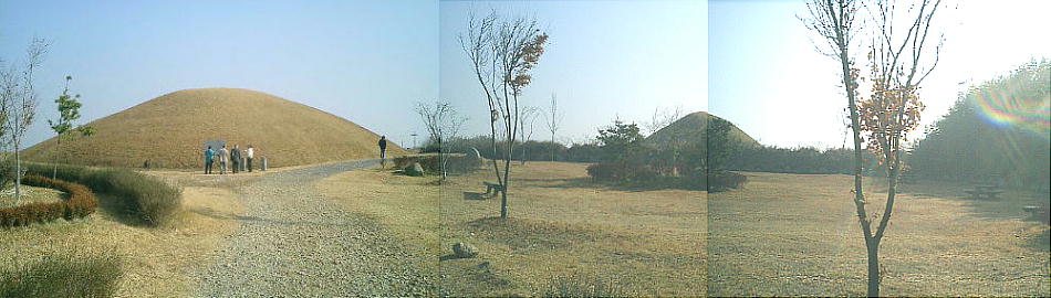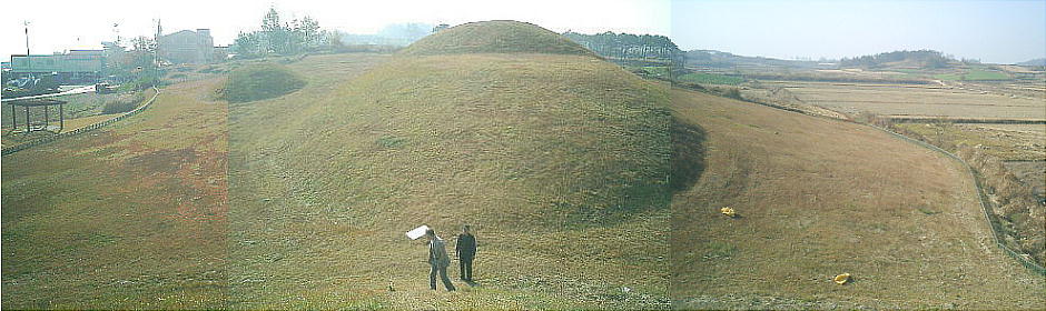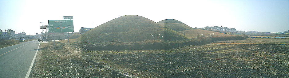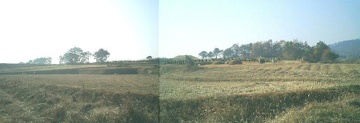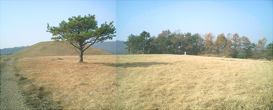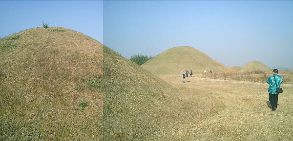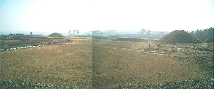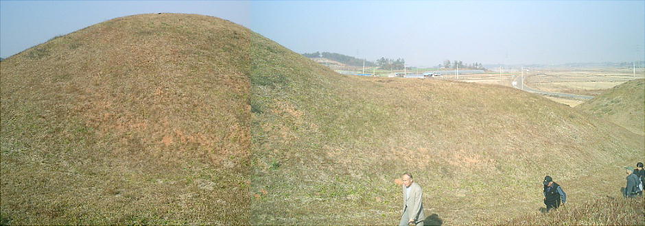 <内洞里双墳>左は1号墳、右は2号墳。1号墳は長さ56m。韓国では長鼓墳というが前方後円墳ではなさそうだ。