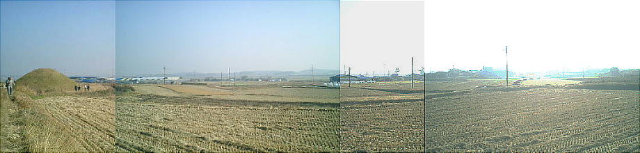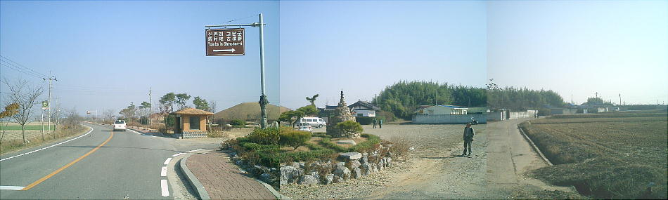 徳山里から新村里古墳群へ向かう。廻りは田圃である(上)。下、遠くに新村里古墳群が見えているが、その手前の