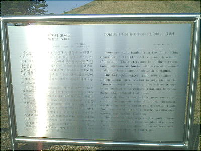 木の後ろが新村里9号墳。右の方の石碑は8号墳と書いてあったが古墳がない。取り壊したのかそれとも林の中だったのか。