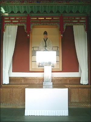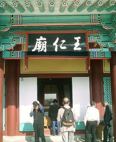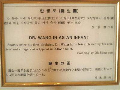 「百済門」を潜ると前方に「王仁廊」が見えてくる。中に王仁博士の肖像画が掛かっている。記帳ノートがあったので