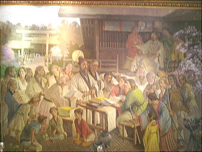 菟道稚郎子ら倭人に千字文を説く王仁博士。さすれば、後ろでいすに座っているのが応神天皇か。
