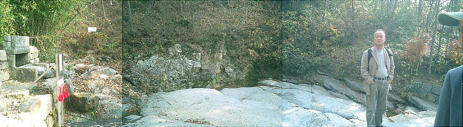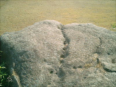 ここが王仁博士の生誕の地。大岩が生まれた家の礎石だそうで、柱を立てていた跡が岩に残っている(と言う)。