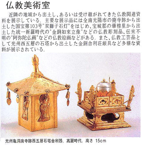 国立光州博物館は1978年に開館した。仏教美術室、絵画室、先史室、原三国・三国室、高麗陶磁器室などを備えている。