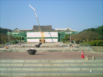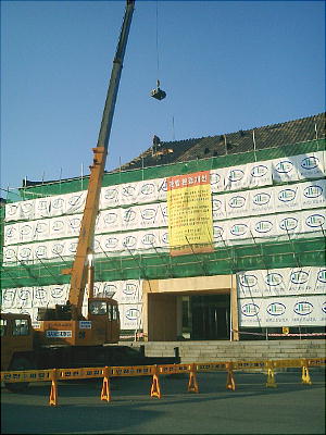 でかいクレーンが危なっかしく作業中であった。どうやら屋根の瓦を葺き代えているらしい。