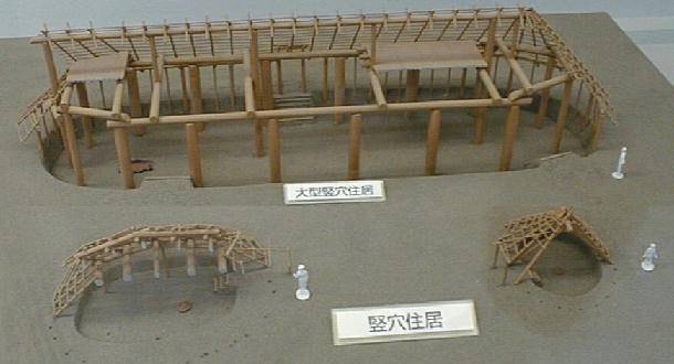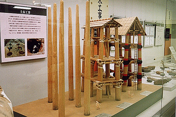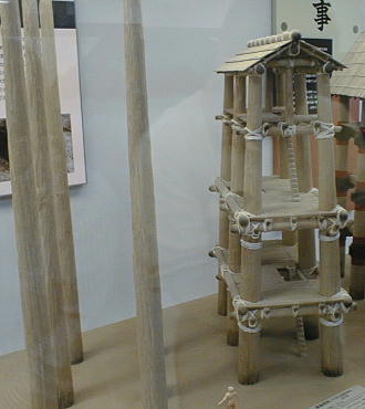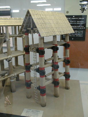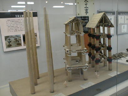下は、発見された建物跡穴から想像される建物の復元模型。6個の巨穴が整然と並んでいた事から、物見台のような建物で