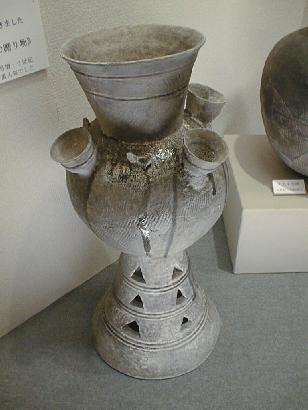 渡来系の人々が住んでいた所には須恵器が多いが、下右の装飾壺も各地で出土している。大上(大上)遺跡出土。古墳時代後期。