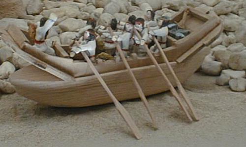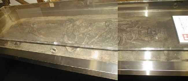 る準構造船の模型。埴輪の足下に展示してあったが、このような船では1船に1頭がやっとだ。どんな思いをして馬は船に