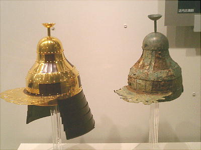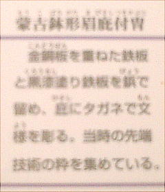 この冑は、黒漆塗りの鉄小札と、鍍金した薄い銅板を重ねた鉄小札とを組み含わせて鋲留している。庇は金銅製で、タガネ