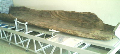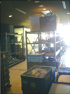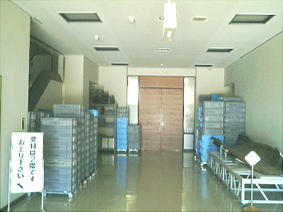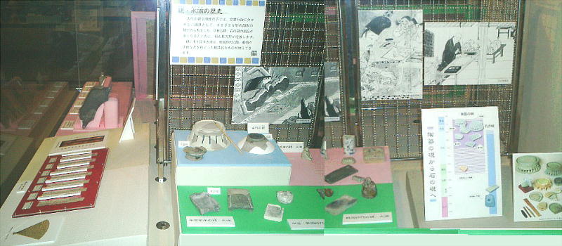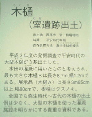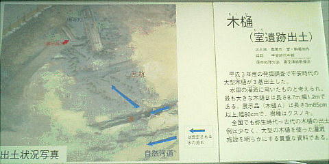 入り口を入ると出土物の詰まったトロ箱が積んである。事務室展示室は2階だ。トロ箱の脇に平安時代の木桶がある。