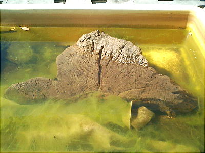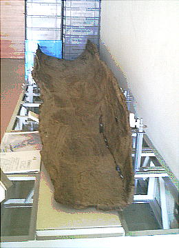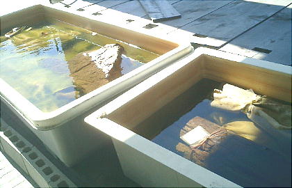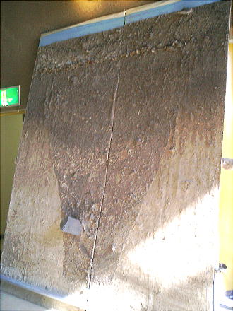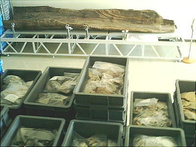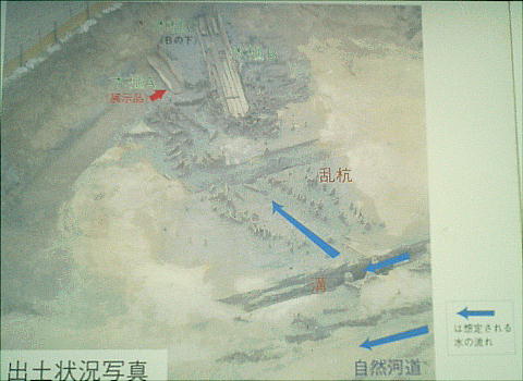 ビルの軒下に、薬品処理中の出土物があった。シートに包まれた木製の出土品らしきものが幾つかプールにつかっている。
