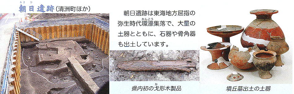 前期の貝塚群や、集落を取り囲む環濠が見られる。朝日遺跡は弥生時代中期になると集落を拡大し、弥生都市的な性格を持