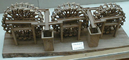 下は朝倉町に現存する三連水車の模型。現物は今でも田んぼの中で動いている。江戸時代後期に造られたものらしいが、今でも現役で
