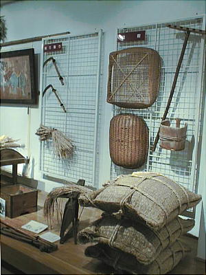 資料館の民俗のコーナーでは、農事暦と年中行事に合わせて農耕具や祭礼用具などを展示して、生活の様子をたどっている。私が子供