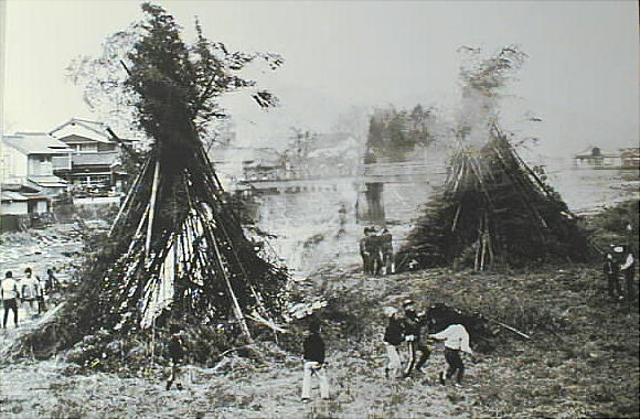 (九州では六〜七日)長い竹数本を円錐状などに組み立て、正月の門松・七五三飾り(しめかざり)・書き初めなどを持ち寄って焼く。
