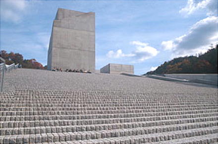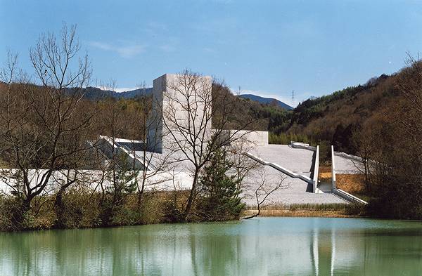 「黄泉の塔」が聳える階段状の建物は安藤忠雄の設計。自身の代表作として挙げるこの作品は、第26回日本芸術大賞他を受
