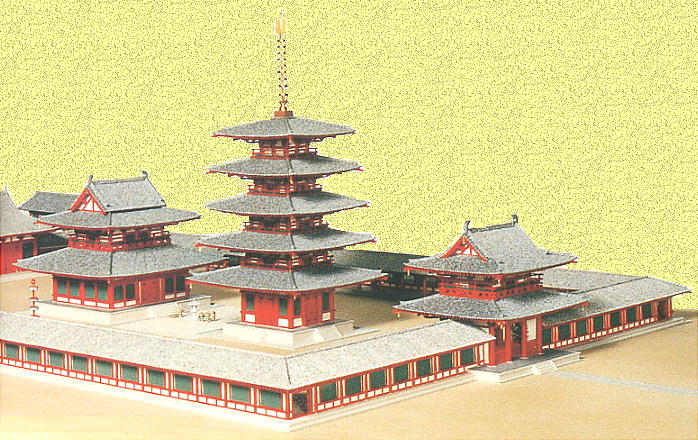 置は「四天王寺式伽藍配置」といわれ、南から北へ向かって中門、五重塔、金堂、講堂を一直線に並べ、それを回廊が囲む