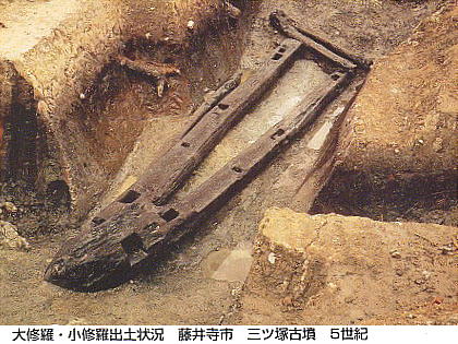 1978年3月に大阪府藤井寺市で三ツ塚古墳(道明寺六丁目)の周濠から、大小2つの修羅が出土。同年4月5日から