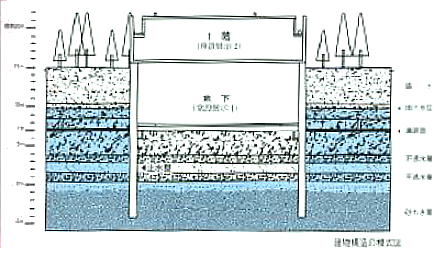 防ぐために,建物のまわりには,厚さ80cmの止水壁が地下20mまで存在する。下の方は,水を通しにくい地層(不通水