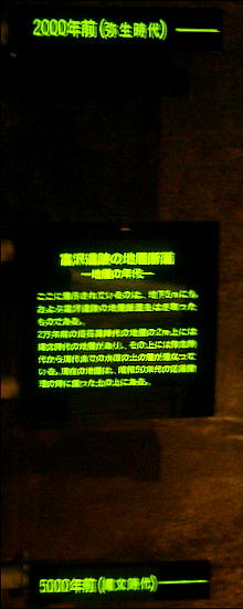 世・平安時代・古墳時代・弥生時代の水田跡、それに植物の根や茎がよく残っている泥炭層が存在し、その下からは縄文時