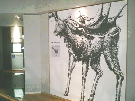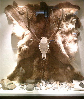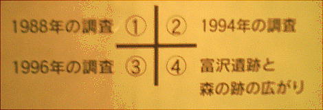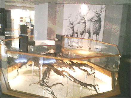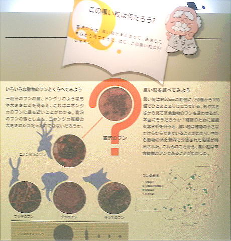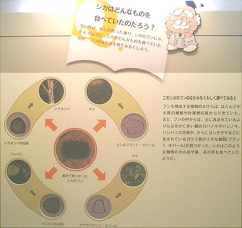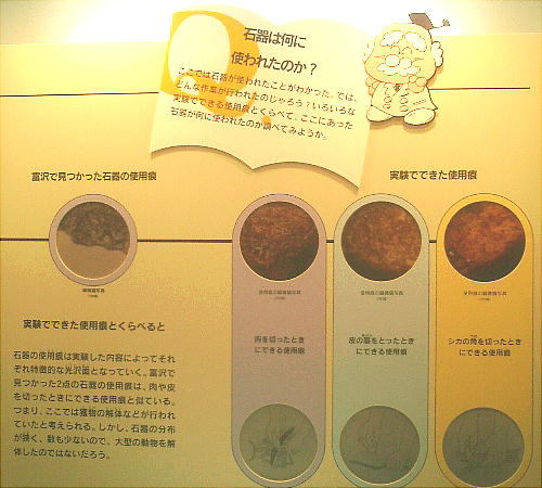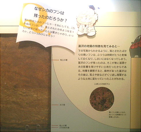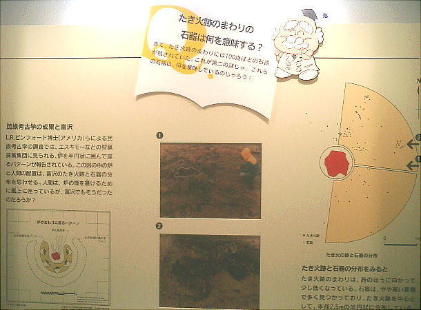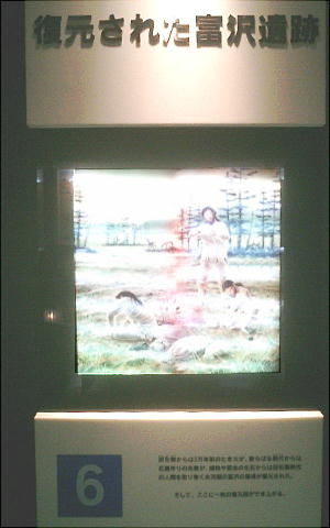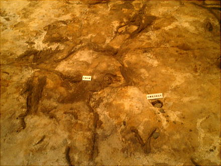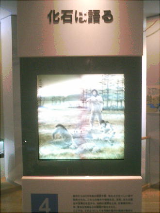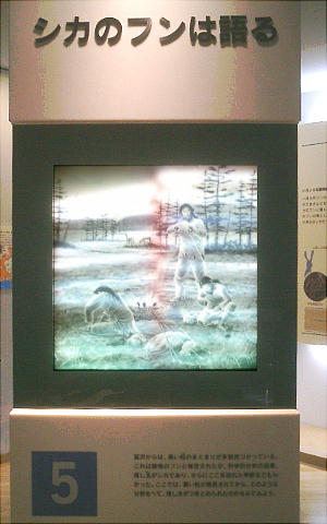 館に入ると,まずこの地下8mの遺跡へと案内される。手摺りにそって歩いていくと,たくさんの樹根,たき火の跡,鹿のフ