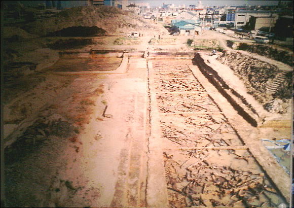 63年(1987・1988)にわたって事前発掘調査が行われた。30次におよぶ発掘調査の結果、地層の上から順に、近世・中
