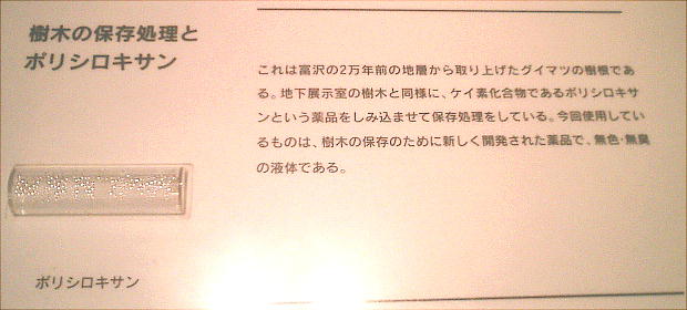 旧石器時代の森林の跡を、発掘されたままの状態で保存公開するために、ここでは特殊な保存処理剤が使われている。無色