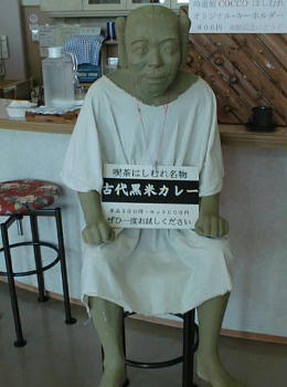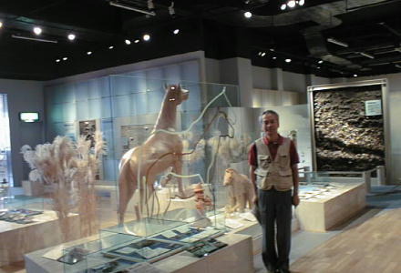 上は古代馬の前でポーズを取る(?)河原さん。下は館内食堂で昼食に食べた古代黒米のカレー。古代人のおじさんが椅子