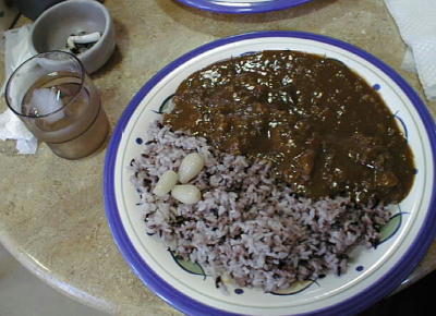 下右の黒い粒が黒米。白米が黒米の色で黒っぽくなっている。全部黒米では食べられない。黒米は歯触りは白米と同じだが