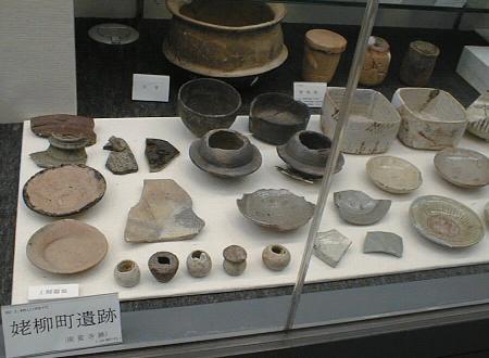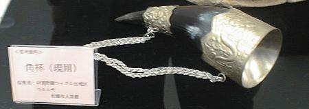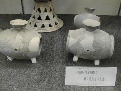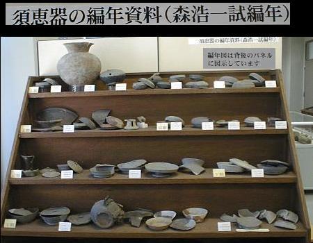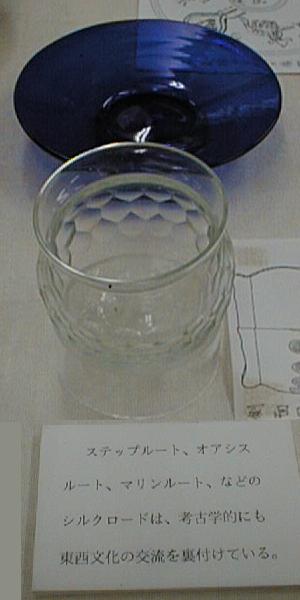 下右のガラス製品(複製)は、森浩一氏が昔発掘した奈良県千塚古墳から出土した皿と深鉢。本物は上野(東京国立