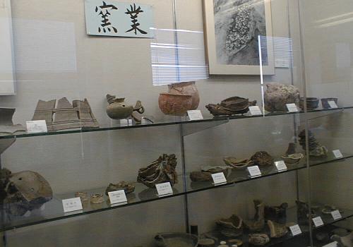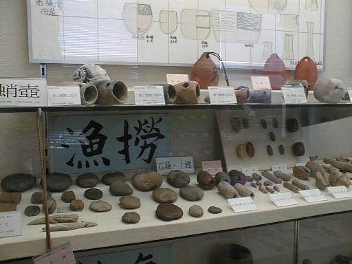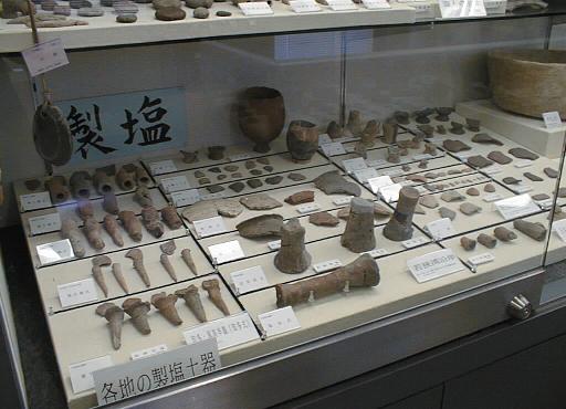 第二展示室には、考古学研究室が重点を置いて取り組んできた製産遺跡(漁労、製塩、製鉄、窯業など)関係資料、