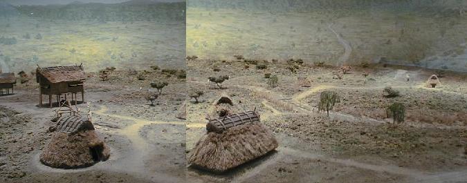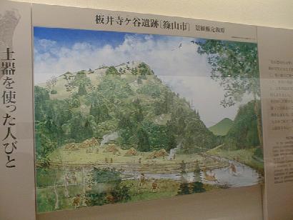 板井寺ケ谷(いたいてらがだに:下右が推定復元画)遺跡は、篠山盆地の北部の宮田川西岸に位置している。旧石器時代の