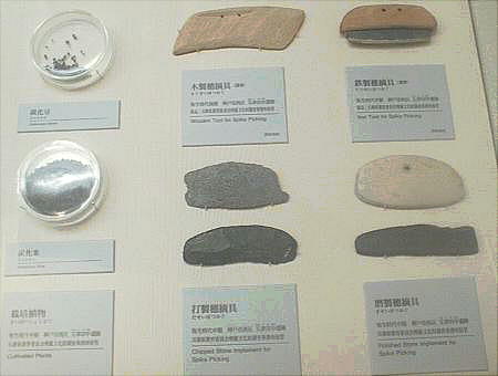 下左右とも玉津田中遺跡の遺物。左には木製と石製の稲穂摘具とその復元品が展示されている。
