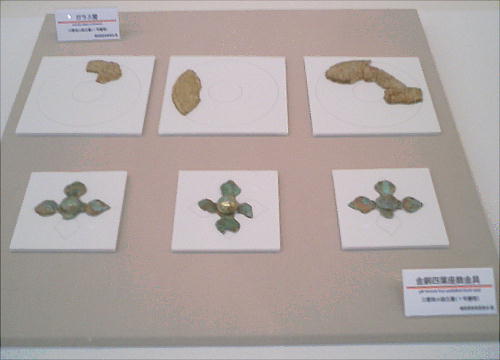 ガラス璧(上)と金銅四葉座飾金具(下)(三雲南小路王墓1号甕棺出土)