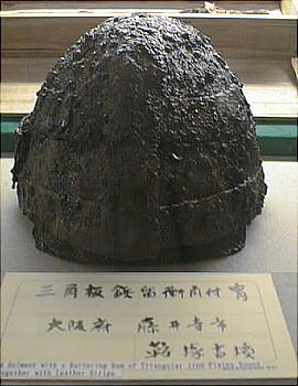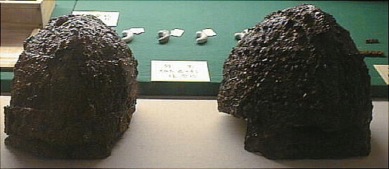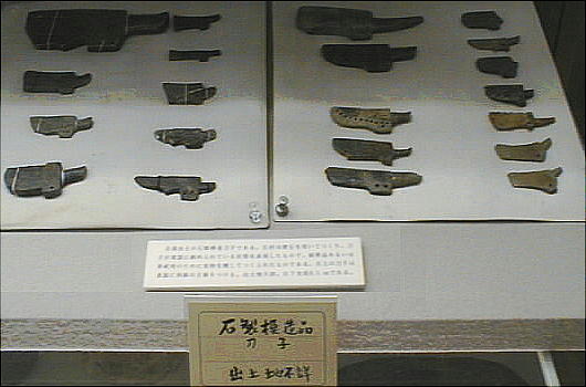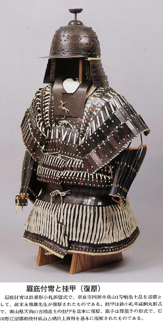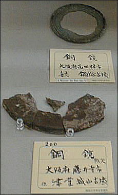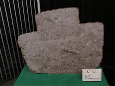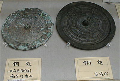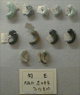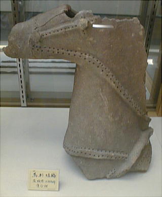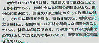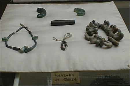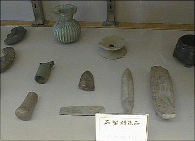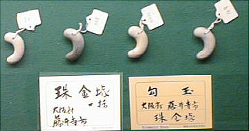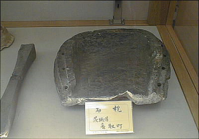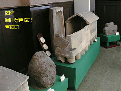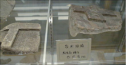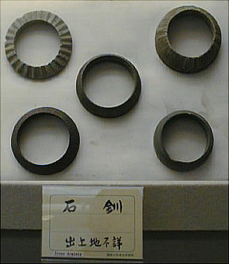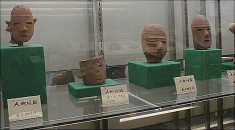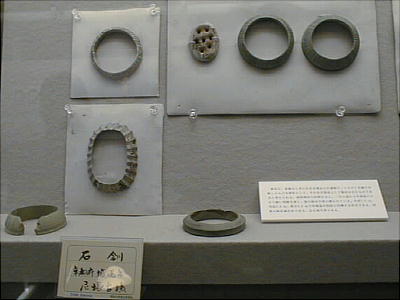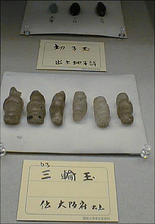 上の2つの石造彫刻は、福岡県八女市の岩戸山古墳から出土したものとされており、石人の頭部と石靱の上半部である。 昭和15年に重要美術品に認定されている。石材は阿蘇溶結凝灰岩と呼ばれる鼠色の加工しやすい岩石で作られており、 赤の彩色がほどこされた跡が残っている。石人の頭部は高さ45cm、石靱の上半部は35cmである。