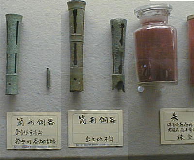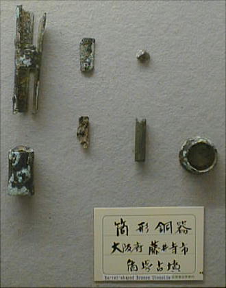 筒型銅器は古墳出土の青銅器の一種で、用途は石突或いは杖の頭、剣の取手などではないかと考えられているが、確か ではない。