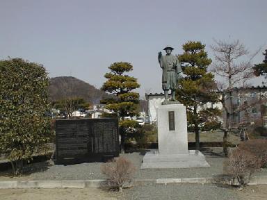 郷土の偉人「岡上次郎兵衛」の銅像と顕彰碑。